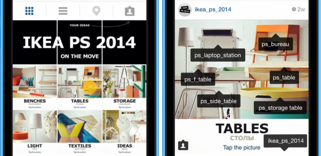 Зайдя на страницу «ИКЕА ПС 2014», вы увидите полноценный каталог продукции из 12 категорий, представленных в виде блоков-картинок. Все изображения тегированы — по клику на них открываются ссылки на индивидуальные аккаунты каждого товара категории (например, страница столика с подсветкой).