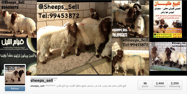 Instagram может служить хорошим маркетинговым каналом не только для магазинов одежды и ресторанов, но и для овцеводческих ферм. Учитывая возрастающую популярность фотоприложения на Ближнем Востоке, находчивый бизнесмен из Кувейта создал один из первых сельскохозяйственных аккаунтов в социальной сети — @sheeps_sell. В нём предприниматель размещает фото овец с указанием номера телефона для оформления заказа.