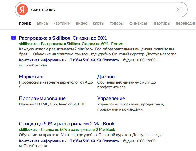 ЦА — покупатели курсов, в предложении применены триггеры выгоды. Сотрудники этой онлайн-школы — хорошие маркетологи: для того, чтобы узнать о скидке, не нужно даже переходить на сайт. Эта информация есть в сниппете и видна уже в результатах поисковой выдачи.
