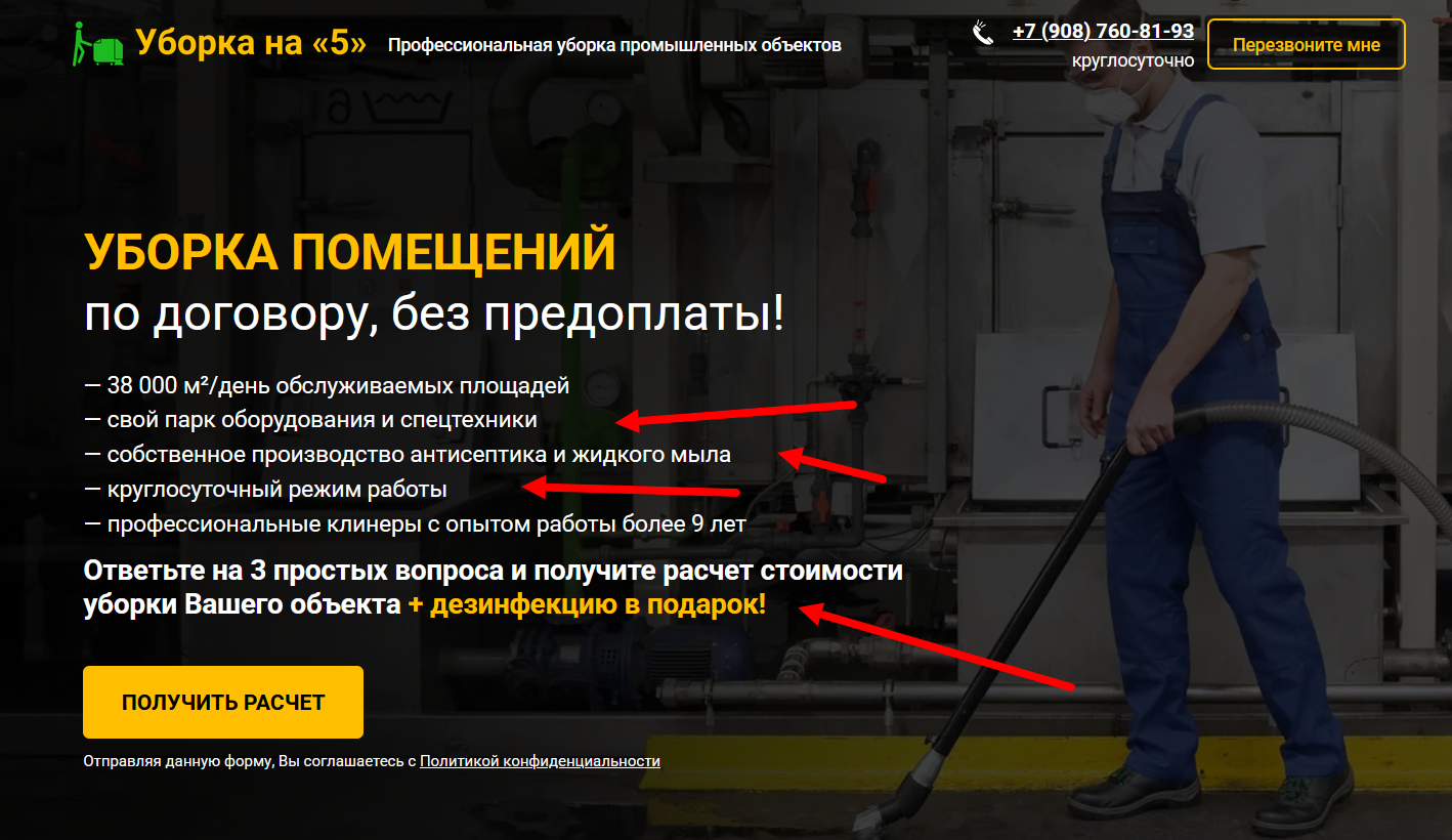 Целевая аудитория — клиенты клининговой компании, а вот набору триггеров можно позавидовать: здесь и выгода, и технологичность, и удобство и даже социальное доказательство — 38 000 метров в день компания обслуживает.