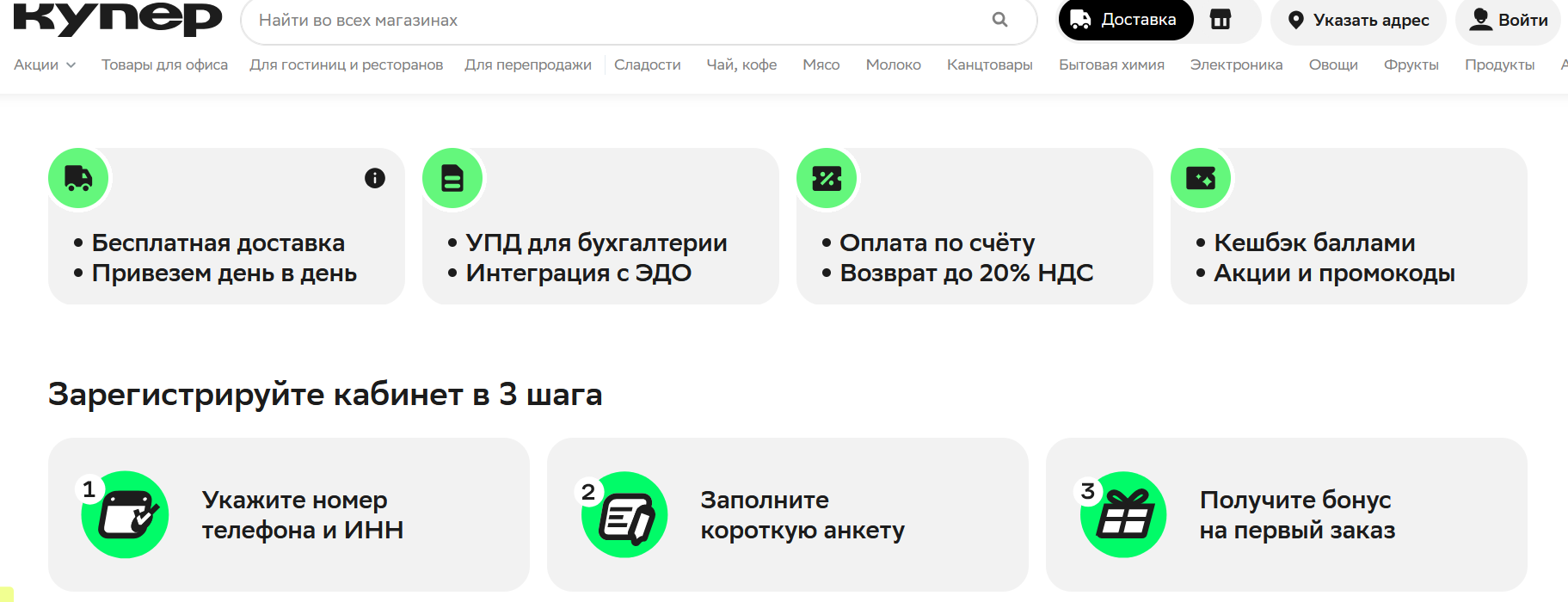 «Купер» — сервис доставки продуктов работает не только для физических лиц, но и для организаций. И конечно, маркетологи подсветили совсем другие преимущества — возврат НДС, интеграция с ЭДО и УПД для бухгалтерии.