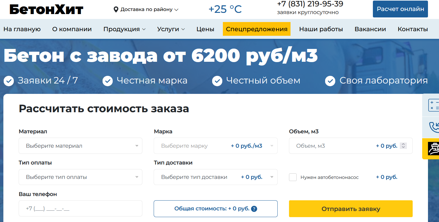 УТП и конкурентные преимущества сформулированы в виде тезисов на сайте: прием заявок в режиме 24/7, собственная лаборатория и честный объем. Поставщик знает, что при доставке бетона часто обманывают, а он гарантирует соответствие объема и таким образом отстраивается от конкурентов.