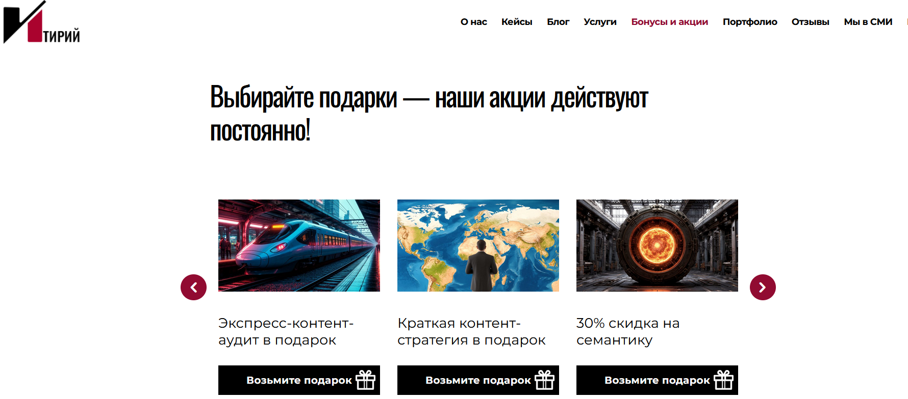 «Итирий» — агентство контент-маркетинга. Помогает бизнесам продвигаться за счет полезного, качественного и интересного контента.
