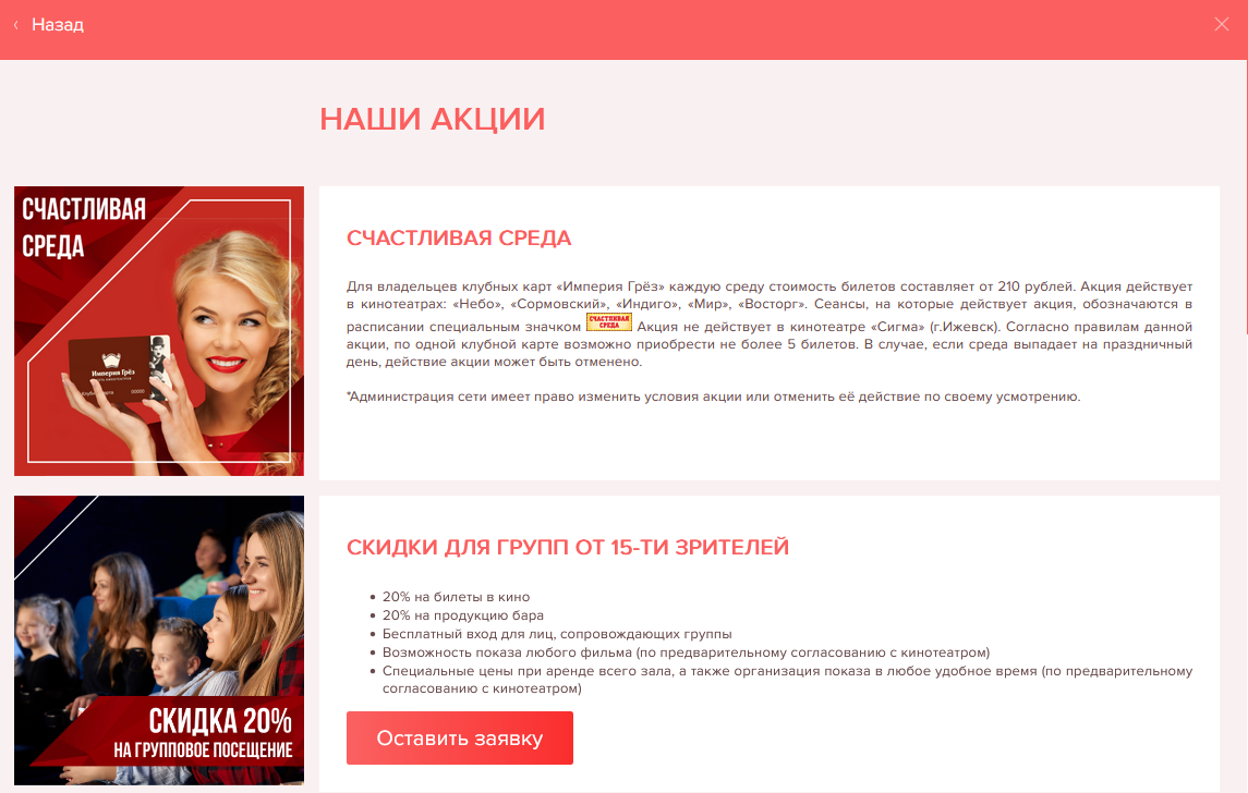 Скидки на посещение кинотеатров для групп более 15 человек.