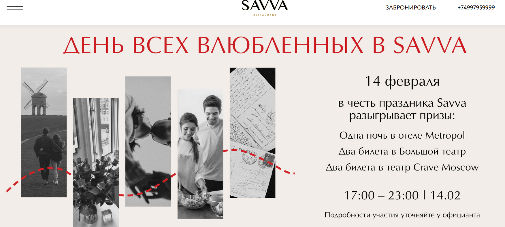 SAVVA — элитный столичный мишленовский ресторан. Он создал целую экосистему партнерских программ: посетители могут выиграть все что угодно — от клатча из крокодиловой кожи до ночи в элитном номере Метрополя. Именно эти вещи часто становятся основой УТП, одно из которых звучит так: