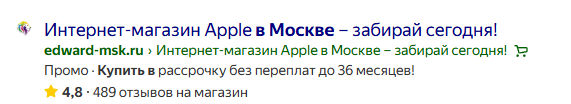 Пример неудачного Title: «Интернет-магазин Apple в Москве — забирай сегодня!». Здесь отсутствует основной ключевой запрос, поэтому пример найден на шестой странице выдачи: