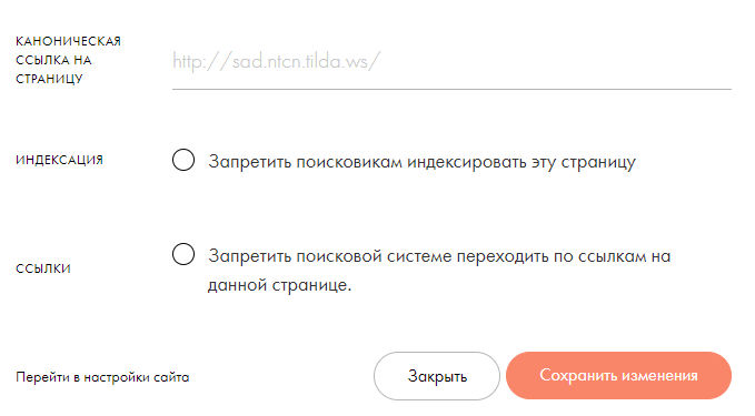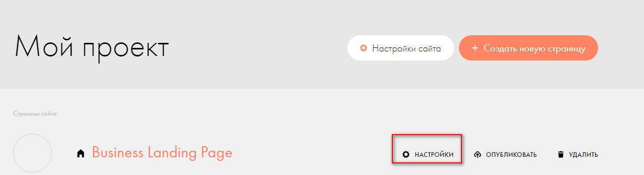 Начну с настроек тега в конструкторе «Тильда». Открываем в конструкторе вкладку со списком страниц и кликаем по ссылке «Настройки» напротив страницы, которую нам нужно отредактировать.