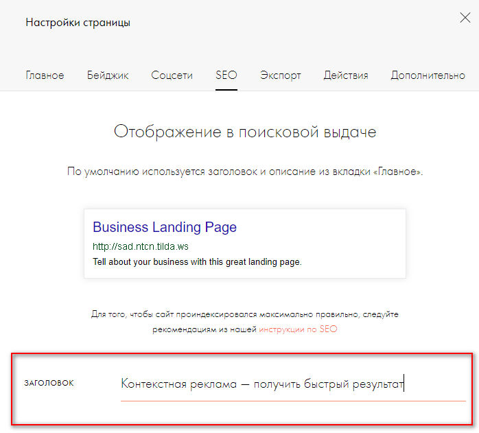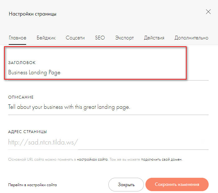 Открывается всплывающее окно с настройками. В базовом варианте можно просто поменять заголовок страницы H1 на вкладке главное. По умолчанию он будет одновременно выполнять и функцию Title. После чего сохраняем изменения.