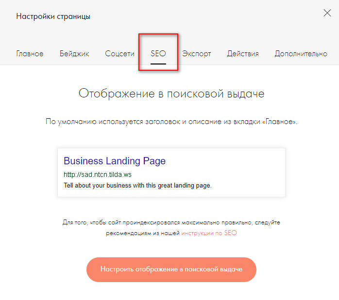 Полноценная настройка Title делается через вкладку SEO. При переходе на эту вкладку нажимаем кнопку «Настроить отображение в поисковой выдаче»: