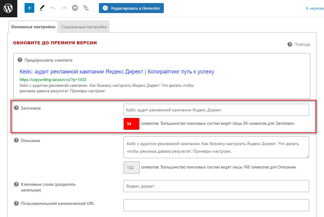 Если на вашем сайте используется CMS WordPress, настройки Title делаются в админ-панели. У меня использован плагин All in One SEO, если у вас использован другой SEO-плагин, визуально поля могут отличаться, хотя общая логика настроек у всех известных мне плагинов одинакова. Открываем редактируемую страницу или запись в редакторе. Листаем вниз и находим SEO-настройки. Заполняем поле «Заголовок». После этого сохраняем настройки: