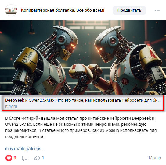 Метатег Title полностью отображается при репосте — как в постах, так и в комментариях к ним, если комментарии содержат ссылку, не выключена функция предпросмотра или не настроена микроразметка так, чтобы показывался в соцсетях другой текст.