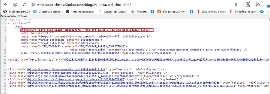 Зайти в код можно, если кликнуть в любом месте страницы правой кнопкой мыши и выбрать в контекстном меню пункт «Просмотреть код страницы». В коде Title тоже отображается полностью: