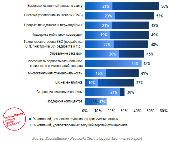 Последнее исследование Econsultancy показало, что 56% владельцев коммерческих ресурсов признают критическую важность высококачественного внутреннего поиска, но при этом только 21% из них доволен текущим решением на собственном сайте.