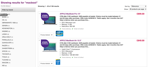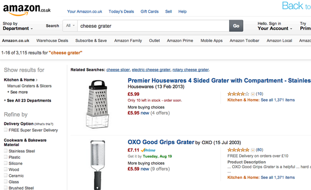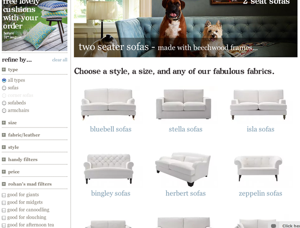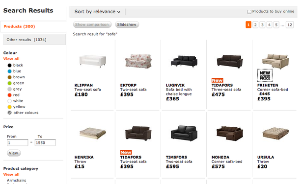 Сайт Ikea выдаёт по запросу «диваны» 300 наименований товара, предлагая ограничить рамки поиска посредством указания нужного цвета и подходящего ценового диапазона. По мнению редактора Econsultancy Грэма Чарльтона (Graham Charlton), этого недостаточно.