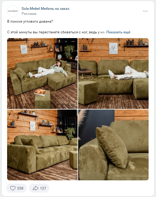 Через какое-то время он увидел в ленте посты компании, заинтересовался моделью и приятными ценами, перешел на сайт, там посмотрел. Но ему еще рано покупать диван, он просто смотрит или добавляет товары в закладки. Это второе «касание».