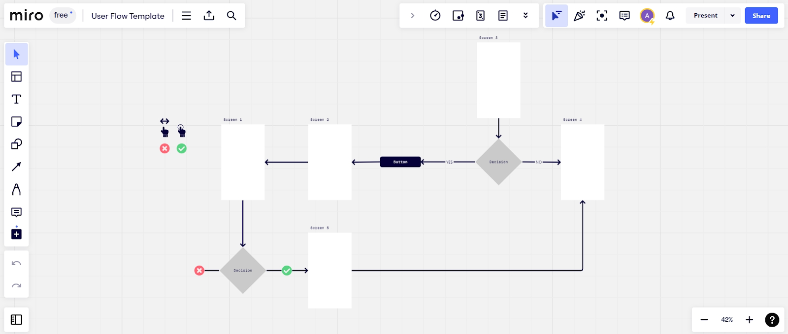 Сервис Miro позволяет создавать доски с диаграммами и схемами как в одиночку, так и целой командой разработки. При выборе специального шаблона для составления пути пользователя открывается диаграмма в которую можно сразу добавить: