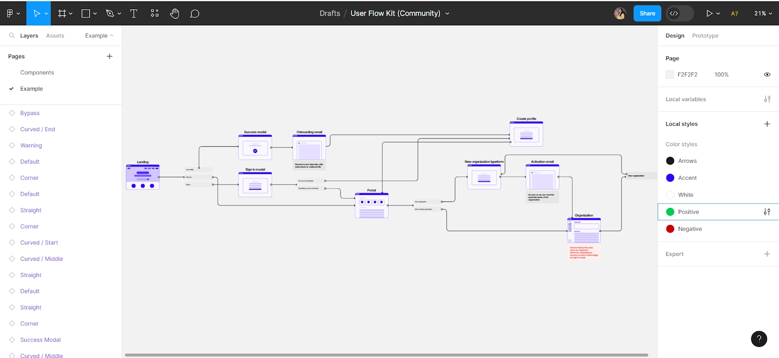 Шаблон для Figma сразу после копирования доступен для редактирования в одиночку. Для того чтобы расшарить проект для команды, его необходимо переместить из черновиков в проекты. Внутри шаблона имеются две страницы: с компонентами, которые можно применять для создания собственного user flow, и страница с примером готового пути пользователя.