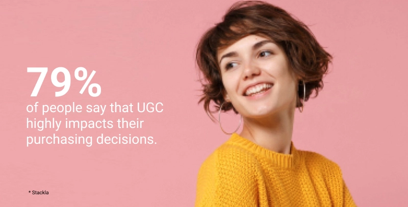 Клиенты доверяют пользовательскому контенту гораздо больше, чем маркетингу. Отраслевые опросы показывают, что 92 % клиентов выражают самое большое доверие к UGC, а не рекламе. 46 % клиентов доверяют онлайн-отзывам других платящих клиентов. 82 % считают, что пользовательский контент играет важную роль в процессе принятия решения.