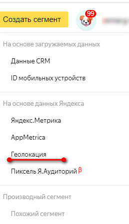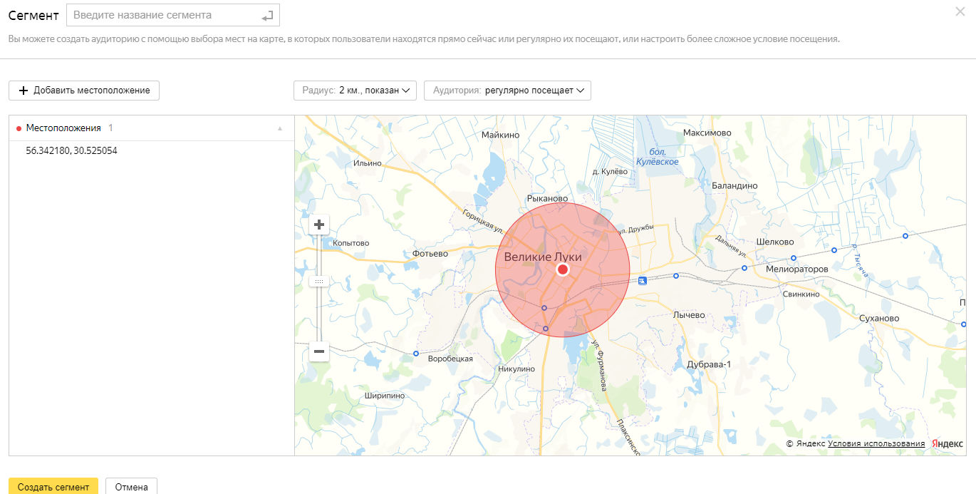 Вы можете создать сегмент аудитории, регулярно посещающих определенные места. Для этого нажимаем на кнопку «Создать сегмент». Из выпадающего списка выбираем «Геолокация».