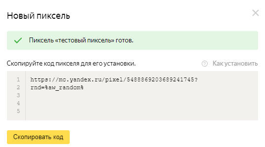 На этом пиксель готов. Остается только скопировать получившийся код и вставить его в объявление. Для этого нажимаем кнопку «Скопировать код»: