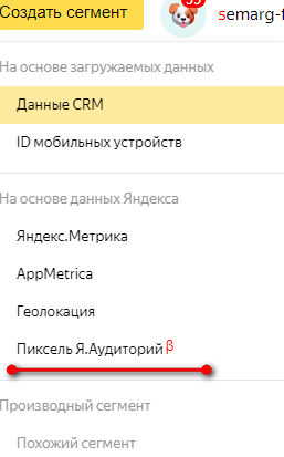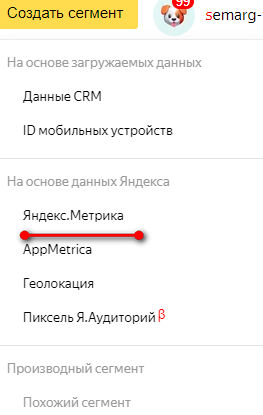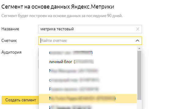 Рассмотрим еще один способ создания сегмента. Для этого вам потребуется настроенная «Яндекс Метрика». Желательно, чтобы она была привязана к этому же аккаунту «Яндекс ID» или заблаговременно открыть доступ к «Метрике». Жмем «Создать сегмент» и выбираем пункт «Яндекс Метрика»:
