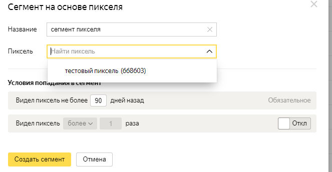 Даем название сегменту. У меня он указан как тестовый, но на «боевых» проектах обычно даю такое же название, как и у счетчика «Метрики»:
