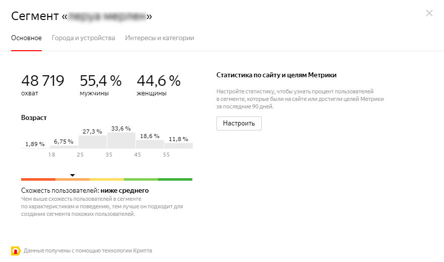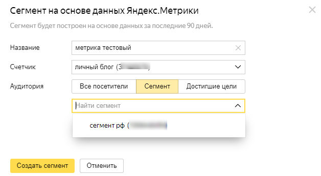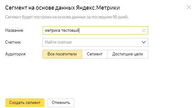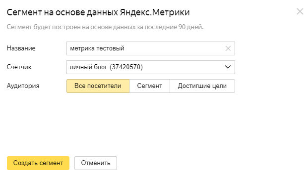 В этом случае данные передаются из «Яндекс Метрики». Необходимо предварительно настроить сегмент в самой «Метрике» |