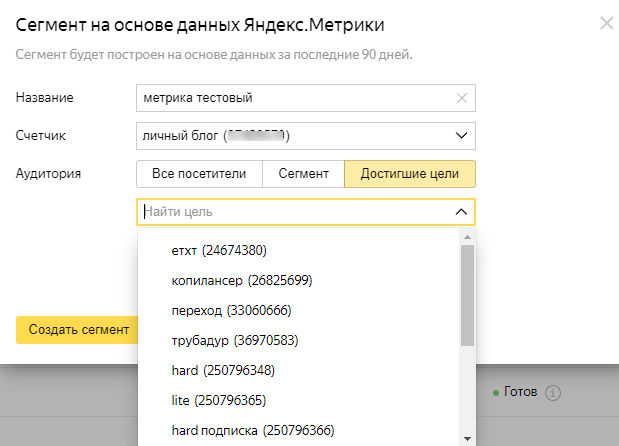 Есть возможность собирать пользователей достигших целей на сайте. Для этого у вас должны быть настроены цели в «Метрике». Кликаем на вкладку «Достигшие цели». Система показывает нам все цели имеющиеся в счетчике, выбираем подходящий вариант.