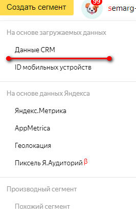 Еще можно создавать сегменты из данных собранных в CRM, а также для рекламы по ID-устройства, собранные через WiFi-радар. Для этого выбираем «Данные CRM или ID мобильных устройств. Я покажу настройку на базе «Данные CRM»: