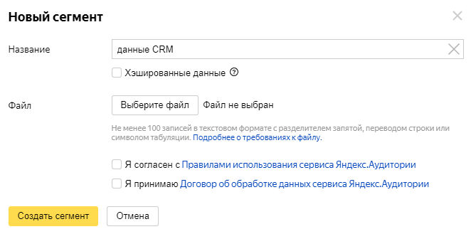 Открывается окно для создания сегмента, которому даем название. С компьютера загружаем заранее скаченный из CRM файл. Ставим галочки согласия с правилами использования сервиса и принимаем договор об обработке данных. Жмем «Сохранить сегмент»:
