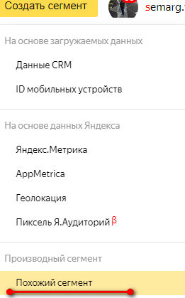 В «Яндекс Аудиториях» есть возможность создавать похожие сегменты. Для этого нужны уже работающие сегменты. Для создания Look-alike в меню выбираем вариант «Производный сегмент».