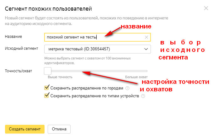 Во всплывающем окне вписываем название нового сегмента, рекомендую называть так, чтобы было понятно что в основе лежит другой сегмент, например: «сегмент похожий на аудиторию А». Дальше выбираем исходный сегмент, обратите внимание что в нем должно содержаться не менее 100 записей. Обязательно настраиваем с помощью ползунка охваты и точность.