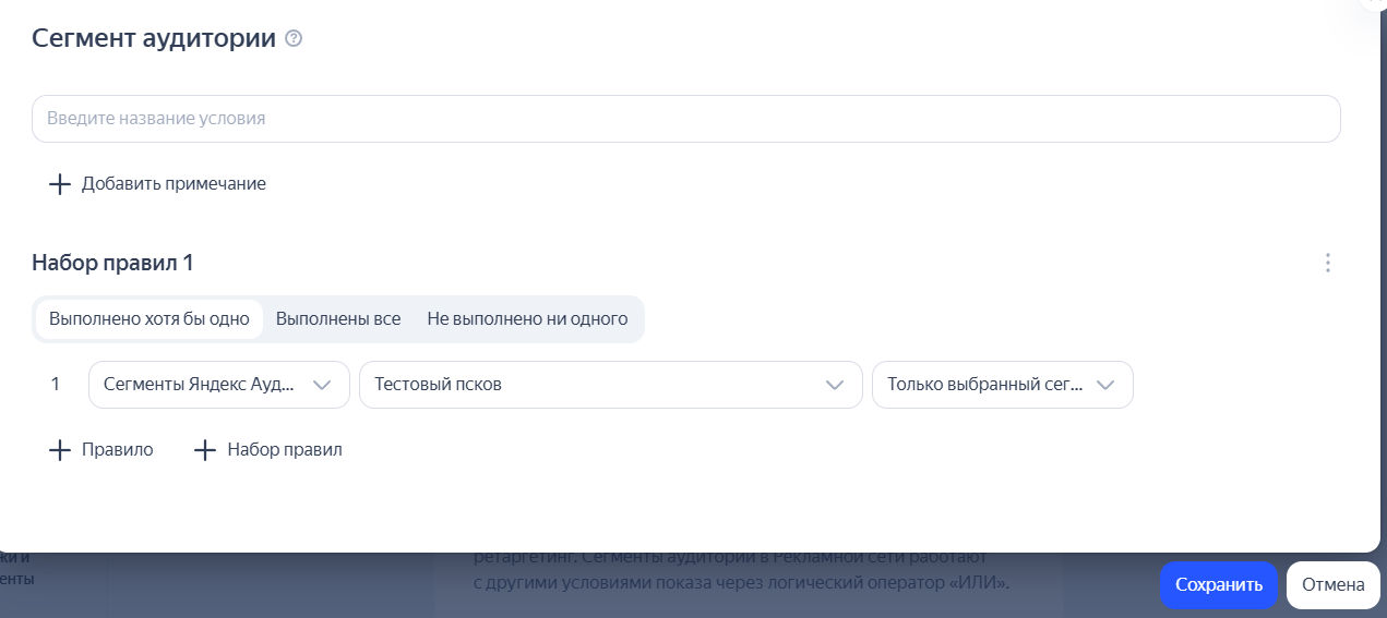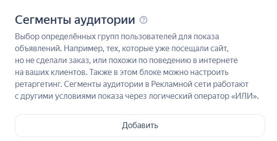 Для использования собранной аудитории в настройках кампании или группы «Яндекс Директа» находим «Сегменты аудитории» и нажимаем на кнопку «Добавить».