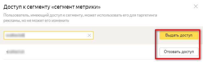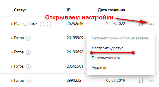 Есть важный момент: по умолчанию можно использовать только сегменты созданные в этом аккаунте «Яндекса». Если аудитории собирались в одном аккаунте, а реклама настраивается в другом, придется дополнительно настраивать права доступа. Для этого жмем на три точки напротив сегмента, кликаем на ссылку «Настроить доступ».