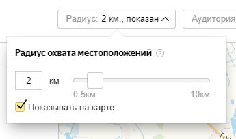 Разберем настройки более подробно. Вы можете выбрать радиус охвата местоположений. По умолчанию предлагается 2 километра. Минимальный радиус — 0,5 км, максимальный — 10 км. Вы можете настроить параметр перетаскивая ползунок или введя нужную цифру в поле ввода.