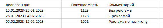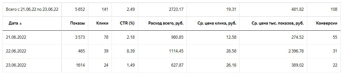 Первая строка 10 дней без рекламы. Это контрольный период. Дальше 10 дней тестировали рекламу со стандартными таргетингами (возраст, интересы). Последние 10 дней показывали объявления с настройками по полигону, в качестве которого использовался популярный конкурент.