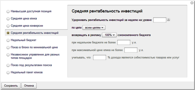 1. Стратегия «Средняя рентабельность инвестиций» эффективна для контекстных кампаний, приносящих более 200 кликов и более 10 целевых визитов в неделю.