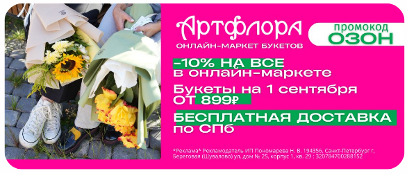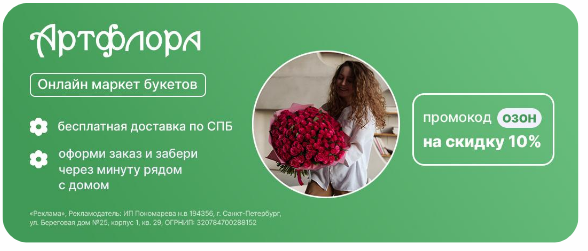 Почти так же хорошо показал себя вариант с конкретным ценовым предложением: недорогой, но эффектный букет по акции (исходная цена 3 250 рублей + дополнительные 10% по промокоду).