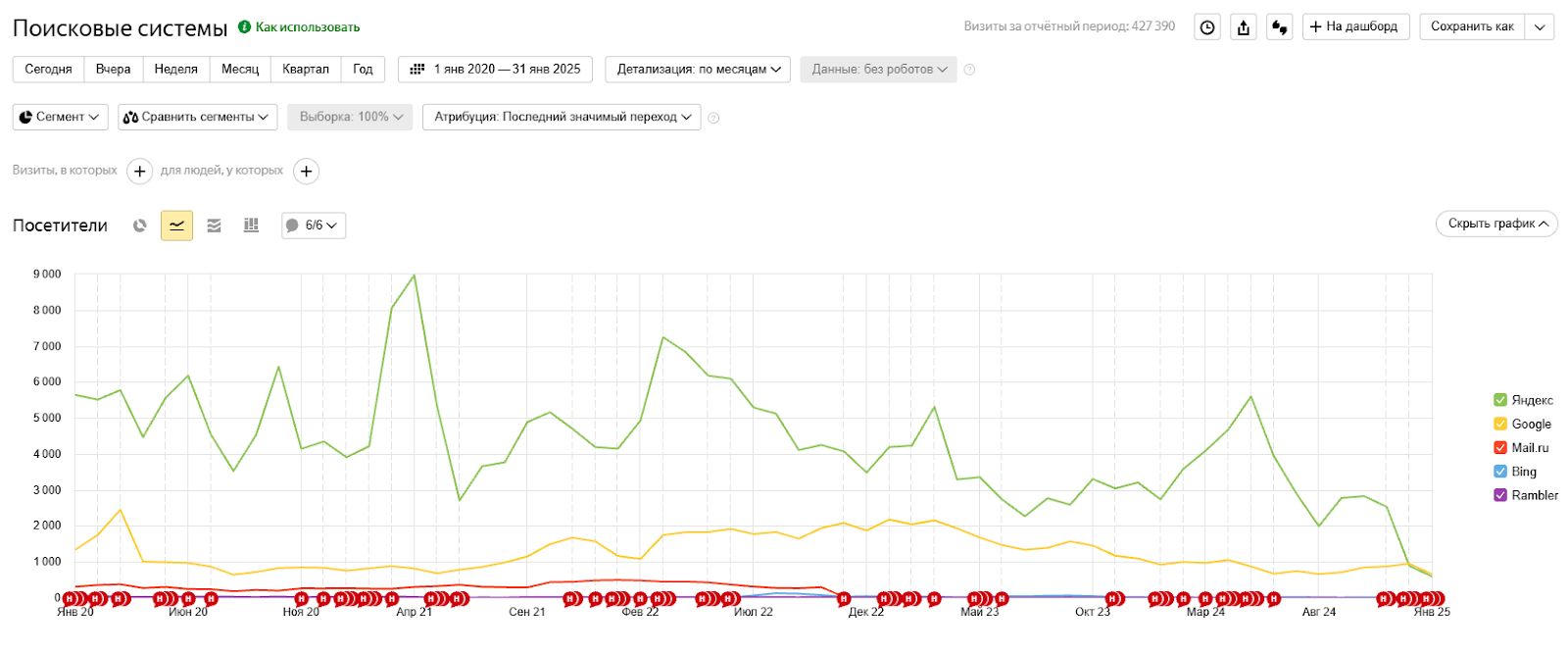Однако несмотря на профессионально выполненные работы, на сайте снижался коммерческий трафик. Мы решили провести анализ, понять причины снижения и восстановить показатели.