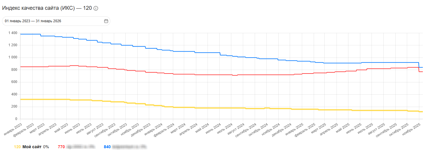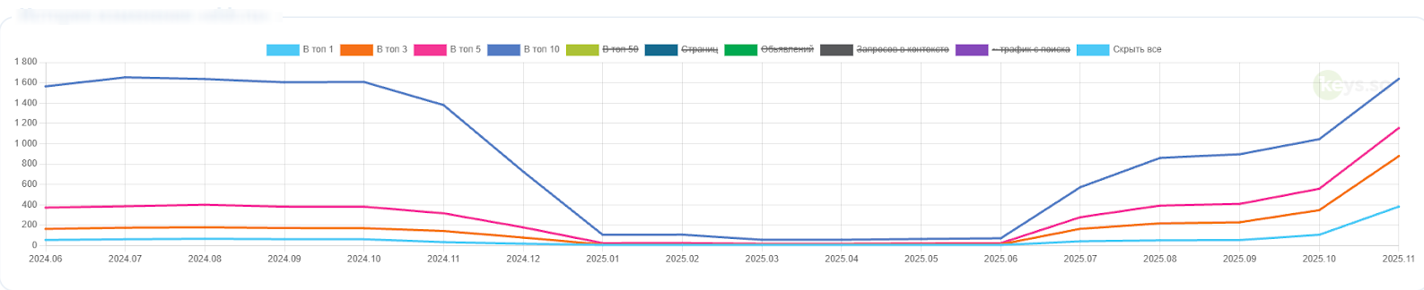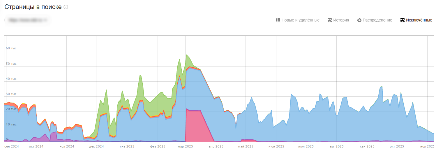 Уменьшили количество малоценных страниц, которые ухудшают видимость сайта, в 6,4 раза: с 27339 в пиковый период марта 2025 года до 4278 на ноябрь 2025.