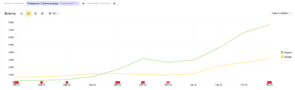 После внедрения новой системы и начала публикации статей, созданных с помощью ИИ, трафик показал устойчивую положительную динамику. С января по ноябрь 2025 года количество визитов выросло в 11,4 раза — с 963 до 10 991.